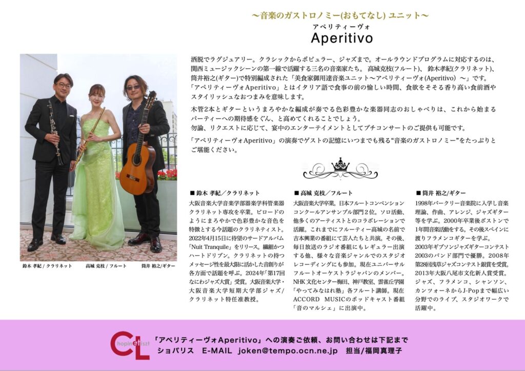 どうか、美食家ご用達音楽ユニット「アペリティーヴォAperitivo」の演奏で、ゲストの記憶にいつまでも残る上質な時間をご堪能ください。